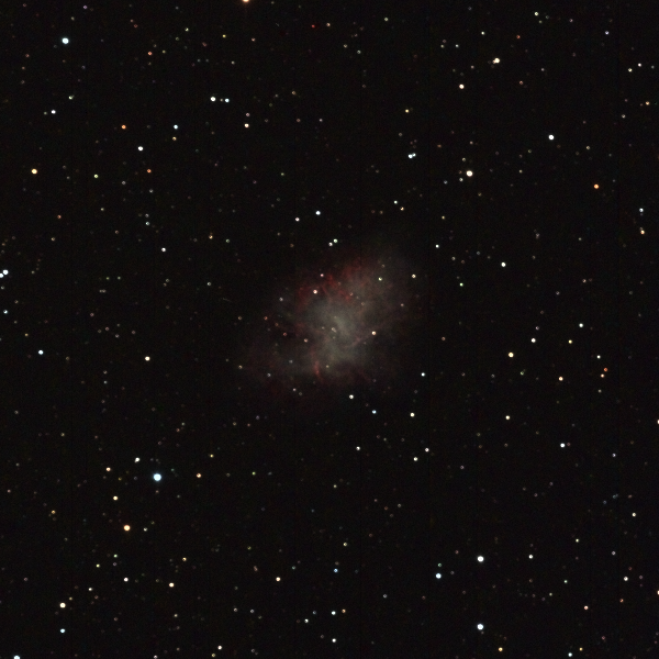 ![]() M1 (Crab Nebula) - 31Dec 2016 - Composite from 1x50"Lum 1x20"Red + 1x20"Grn + 1x20"Blu A supernova remnant and pulsar wind nebula 6,500LY away in the constellation of Taurus. Dia 11 LY, AppMag 8.4, 0.4' x 0.3' Taken 20:50 with Tenerife High Mag Telescope T2: 432mm (17") Dia x 2,940mm f/6.8 FOV: 43'x43' Camera: 4096x4096 px |