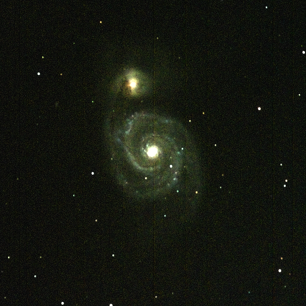 ![]() M51 (Whirlpool Galaxy) - Composite from 1x50"Lum 1x20"Red + 1x20"Grn + 1x20"Blu A Seyfert galaxy, enhanced by a seeming close encounter with NGC 5195. located 23,000,000 LY away in Canes Venatici. Dia 86,000 LY, 11' x 7', AppMag 8.4 Taken 04:00 17Jan2017 with Tenerife High Mag Telescope T2: 432mm (17") Dia x 2,940mm f/6.8 FOV: 43'x43' Camera: 4096x4096 px |